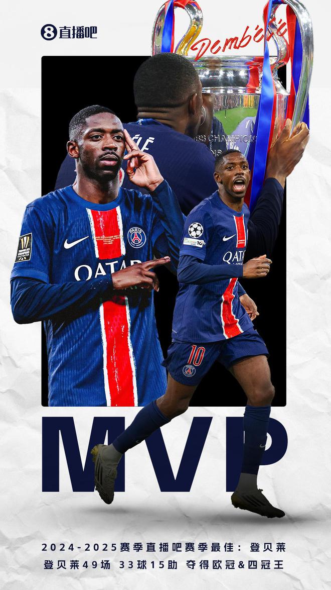 真香!直播吧2024/25五大聯(lián)賽MVP:登貝萊!49場33球15助&四冠王